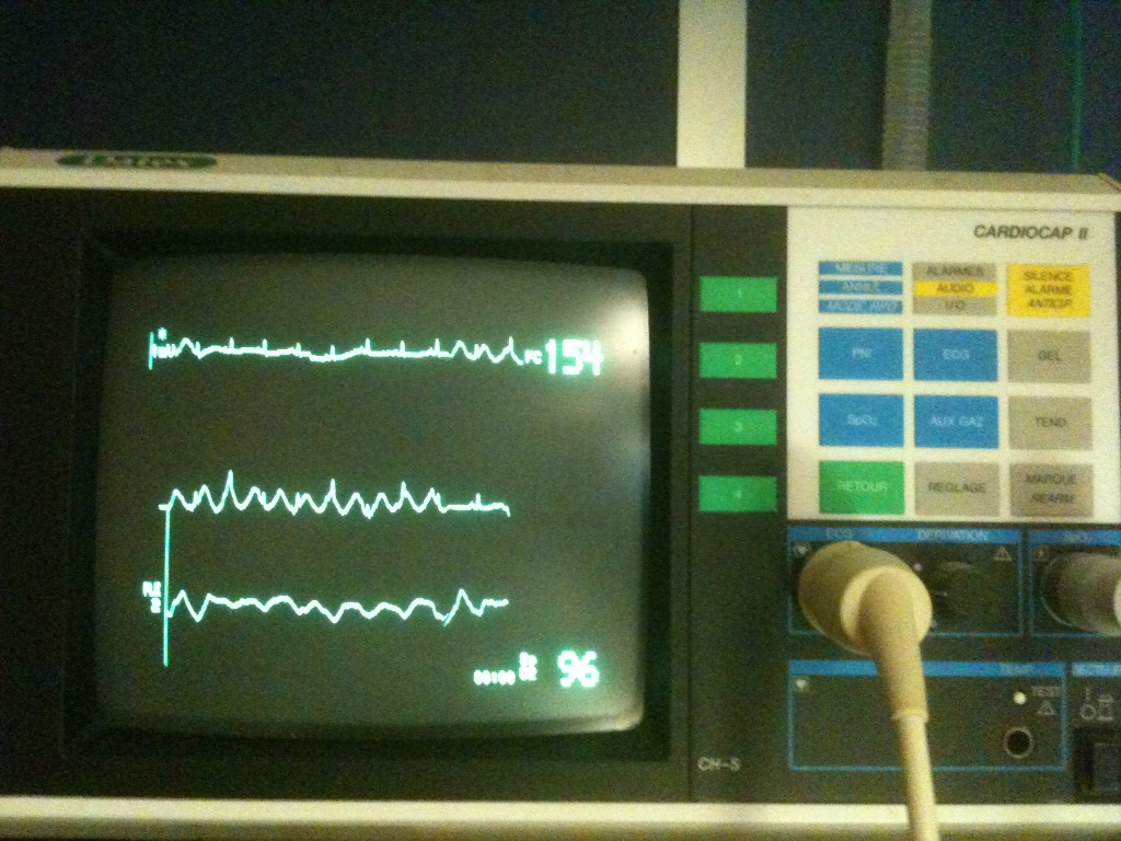 - Un oxymètre de pouls branché sur la langue qui indique la saturation en oxygène et les valeurs de C02 (dioxyde de carbone) inspirées et expirées